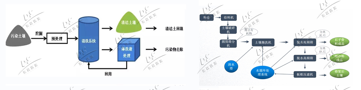 污染土淋洗分選系統(tǒng)借助能促進(jìn)土壤環(huán)境中污染物溶解或遷移的化學(xué)/生物化學(xué)溶劑對污染土進(jìn)行洗潔處理,將附著于土壤顆粒表面固相低濃度污染物轉(zhuǎn)移至液相,使污染元素進(jìn)入液相,便于后續(xù)集中處理。同時將附著于土壤顆粒表面的高污染土壤顆粒分級分類處理。洗脫廢水再進(jìn)入污水處理系統(tǒng)對污染物做進(jìn)一步回收處理,最終實現(xiàn)土壤修復(fù)目的。淋洗溶液主要包括: 清水,主要用于溶于水的重金屬離子的去除;無機(jī)溶劑,如酸、堿、鹽,通過酸解、絡(luò)合或離子交換作用來破壞土壤表面官能團(tuán)與污染物的結(jié)合;人工螯合劑及檸檬酸、蘋果酸等天然螯合劑,主要用于重金屬的去除。