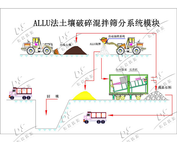 土壤破碎混拌系統主要是采用液壓破碎鏟斗、高效多級土壤篩、雙齒輥式土壤破碎機等專業設備對污染土壤進行破碎、篩分、混合、穩定、攪拌等綜合作業,在固化劑、藥劑作用下實現對污染土壤的穩固、無害化及再利用處理。